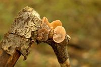Leg de serene schoonheid van het herfstbos vast met deze sfeervolle, gedetailleerde foto. Vanuit de linkerhoek ziet u een elegant gebogen tak komen, versierd met het unieke, oorvormige echt judasoor (Auricularia auricula-judae). De paddenstoel die hier centraal staat, heeft een fascinerende, kraakbeenachtige textuur en een warme oranje…
