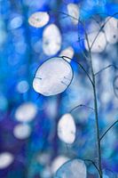 Een fotobewerking van de zaadblaadjes van de Judaspenning met een blauwe achtergrond. De bokeh in de achtergrond sluit aan de de witte penningen van de plant.