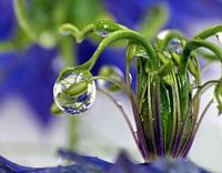 Wist je dat de mooie bloemen en zaden eetbaar zijn van deze plant? Het schijnt naar nootmuskaat te smaken... Om die reden worden de zaden ook wel 'zwart nootmuskaat' genoemd. De latijnse naam is: Nigella Damascena. Je ziet de gedroogde bloemen en zaaddozen ook wel in droogboeketten. Hier is het Juffertje gefotografeerd met een druppeltje.