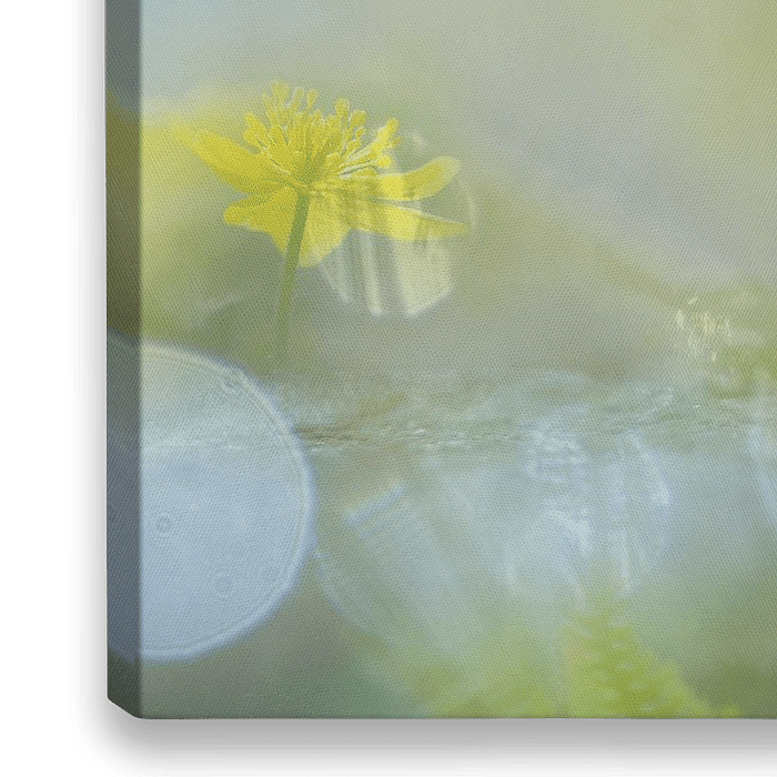 Fantasie beeld met een juffer die neergestreken is op een gele bosanemoon temidden van varens en witte bosanemonen. Sprookjesachtige sfeer door de lichtcirkels, pasteltinten en de zonnestralen.
