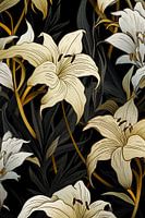Een kleurrijk digitaal schilderij van lelies of een donkere achtergrond. Dit werk is geïnspireerd door de vormen en het kleurenpallet van de Jugendstil beweging. Het werk geeft een warme en klassieke uitstraling aan uw interieur!
