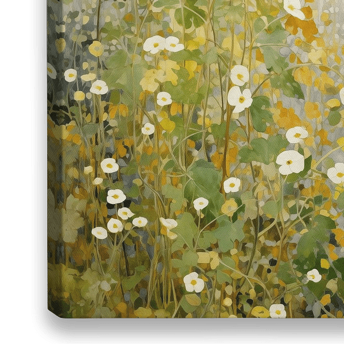 Een kleurrijk digitaal schilderij van een wilde elegante bebossing met witte bloemen. Het werk geeft een warme en klassieke uitstraling van uw interieur!