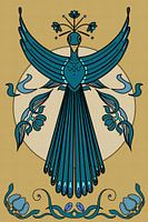 De jugendstil of art nouveau (art-nouveau geschreven in samenstellingen) is een kunststroming die tussen 1890 en 1914 in Europa populair was. Deze pauw is geïnspireerd door de sierlijke vormen en lijnen die kenmerkend zijn voor deze kunstvorm. In dit werk vliegt de pauw en heeft zo ook wel wat weg van een feniks. De kleurkeuze is hedendaags, mosterdgeel en blauwgroen, passend in een modern interieur.