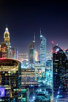 Uitzicht op het Jumeirah Emirates Towers Hotel in Dubai. Verlicht in de avond.