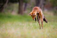 Deze vos was aan het jagen op kikkertjes in het gras. Meestal nam zij niet de moeite om te springen maar greep ze de kikkers zo uit het gras. Hier had ik het geluk dat ze toch sprong.