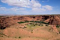 Een prachtig overzicht bij Junction Overlook in Canyon de Chelly, Arizona, Verenigde Staten. Het ligt langs de South Rim Drive in de buurt van Chinle, Arizona. Een goed panorama van de canyon is te zien vanaf het uitkijkpunt. De splitsing die te zien is vanaf het uitkijkpunt is het punt waar Canyon del Muerto (canyon van de doden) zich…