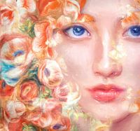 Abstract schilderij. Fantasie portret van een vrouw met bloemen en vlinders. Mixed media impressionisme met als thema zomer.