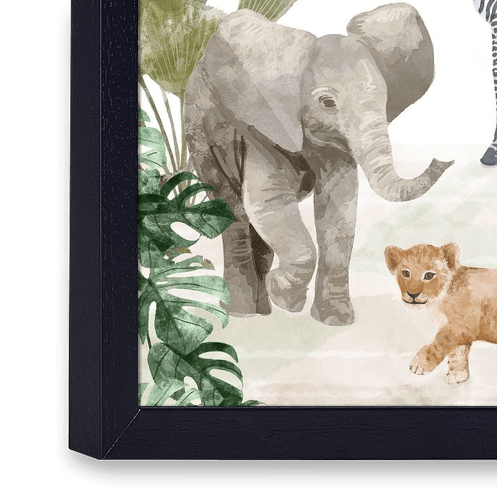 Gezellige jungle afbeelding in aquarel stijl met drie babydieren en twee toekans. De olifant, leeuw en zebra genieten van een dagje in de jungle.