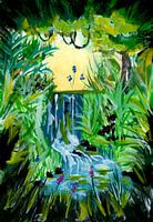 decoratief gouache kunstwerk van een kleine waterval ergens midden in de groene jungle met veel planten en het uitzicht op een kleine open plek.