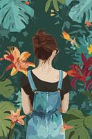 Een illustratie in een moderne stijl toont een vrouw in denim tuinbroek tegen een weelderige tropische achtergrond. De compositie wordt verlevendigd door grote monstera bladeren in turquoise tinten en opvallende oranje en bordeauxrode lelies. Het geheel straalt een serene, botanische sfeer uit met een perfect evenwicht tussen…