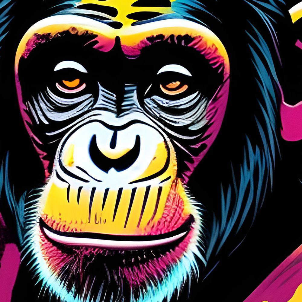 De chimpansee kijkt de toeschouwer met een ondeugende blik aan, terwijl de achtergrond het geheel verankert in een mysterieuze en artistieke sfeer. Dit kunstwerk is niet alleen een visueel spektakel, maar ook een uitnodiging om de vreugde en speelsheid van het moment te omarmen. Jungle Joy is een viering van kleur, vreugde en de onweerstaanbare charme van deze vrolijke chimpansee.