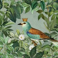 Vogel met kroon in groene vegetatie, illustratie in vintage stijl