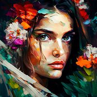 Prachtig portret van een mooie vrouw. Palletmes techniek. Abstract vormgegeven door strepen en abstracte bloemen. Het lijkt een Hawaiaans doorkijkje in de jungle. Contrasterende en complementaire kleurstelling.