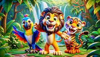 Midden in het dichte groen van de jungle zijn drie stralende vrienden samengekomen om een uitbundige parade te vieren. Een prachtige leeuw, een levendige tijger en een kleurrijke papegaai dansen en zingen in harmonie met de natuur. Hun heldere ogen en brede glimlach werken aanstekelijk en nodigen iedereen uit om mee te doen. Achter hen is een levendig landschap van weelderige planten en watervallen die de scène vullen met levensenergie en tropische schoonheid.