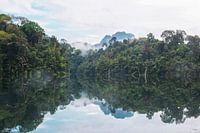 Prachtige plek, onvergetelijk. In de jungle in Thailand - Khao Sok. Natuurpark. Weerspiegeling van een stukje oerwoud en rotsgebergte.