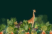 Botanisch beeld met allerlei jungle dieren zoals de giraffe, aap en zebra. Uitermate geschikt als behang of mooie panorama. De achtergrond kleur kan de ontwerper gratis voor je aanpassen. Zoek je een mooie illustratieve plaat? Je hebt hem gevonden!