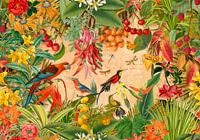 Tropische jungle met exotische papegaaien, planten en bloemen in een vintage look