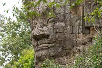 Stenen boeddhabeeld omgeven door bomen en struiken boven een geheime ingang van de fascinerende en mysterieuze jungle tempel Ta Prohm in Angkor Wat, Cambodja.