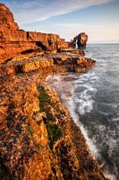 Jurassic Coast, Engeland met Pulpit Rock bij zonsondergang. Dit is het zuidelijkste puntje van het schiereiland Portland in Dorset. Pulpit Rock is een restant van een steengroeve. Eind 19e eeuw werd een natuurlijke boog weggesneden. De rotsblokken die tegen de pilaar in zee leunen lijken op een opengeslagen bijbel tegen een preekstoel. De plek is een toeristische trekpleister geworden.