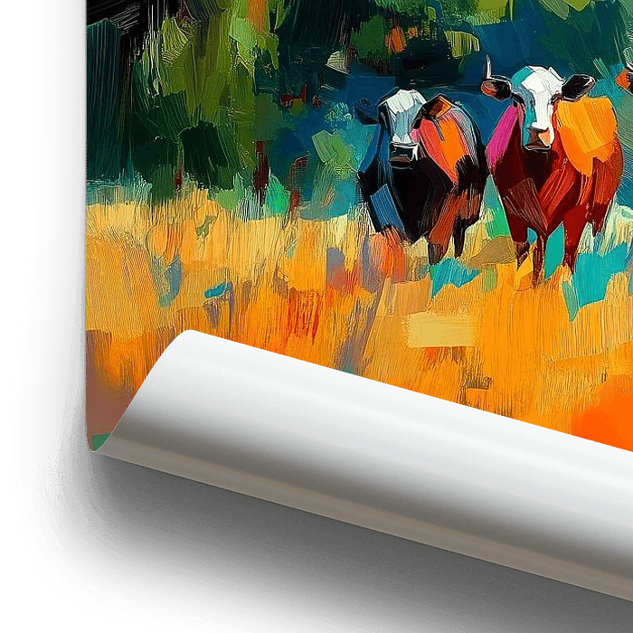 Een kleurrijke, impressionistische weergave van een landschap met een rij koeien tegen een achtergrond van glooiende heuvels en akkerland. Het tafereel is levendig met een helderblauwe lucht en stukken groen en goudkleurig gras.