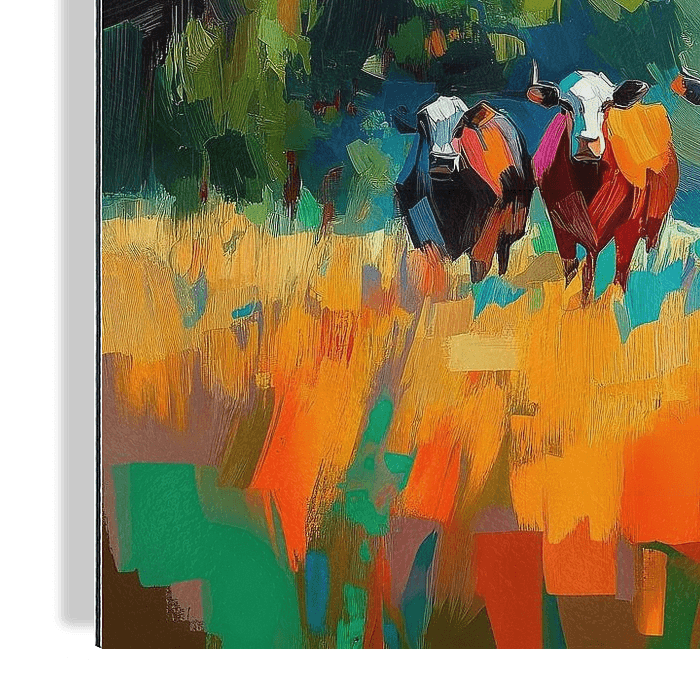 Een kleurrijke, impressionistische weergave van een landschap met een rij koeien tegen een achtergrond van glooiende heuvels en akkerland. Het tafereel is levendig met een helderblauwe lucht en stukken groen en goudkleurig gras.