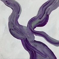 Abstract schilderij met grijze achtergrond. Het hoofdonderwerp is een golvende voorstelling in diverse kleuren paars en donkergrijs. Uitgevoerd op vierkant canvas. Het originele schilderij is gemaakt met acrylverf.
