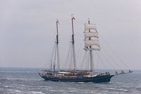 Zeilschip de Stad Amsterdam met de koning aan boord verwelkomt de deelnemende schepen aan de Sail 2013 te Den Helder waaronder deze deelnemer