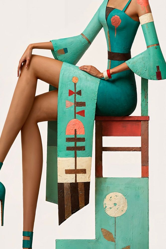 Een surrealistisch modeportret van een vrouw die elegant poseert op een aparte hoge stoel, ze draagt ​​een uitgebreide fantasierijke outfit geïnspireerd op fantasie en natuur. De algehele stijl is modern, artistiek en speels, een combinatie van mode-illustratie en surrealistische elementen.