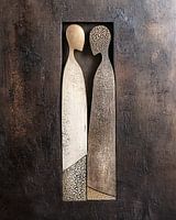 Abstract portret van een man en een vrouw in minimalistische sculptuur stijl in beige en bruin tinten in een gelaagd 3d effect met een grove textuur.