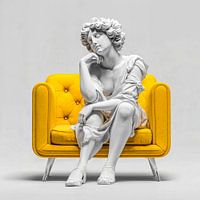 Een klassiek marmeren beeld van een vrouw in een peinzende houding op een gele moderne bank. De compositie benadrukt de waardige aanwezigheid van het beeld en creëert een opvallend visueel evenwicht tussen de organische vorm en het geometrische meubilair. De afbeelding combineert klassieke beeldhouwkunst met modern design en creëert zo…
