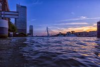 De Kop van Zuid tijdens zonsondergang/blue hour gezien nét over de waterlijn wat een mooi effect teweeg brengt.