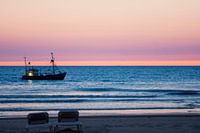 Het Zandvoortse strand 's avonds rond een uur of negen ligt er verlaten bij. Lege strandstoelen en een vissersboot maken een ideaal plaatje voor een zonsondergang foto.