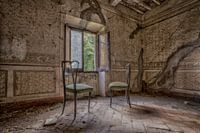 Stoelen voor een open raam in een verlaten woning ergens in Toscane, Italië