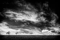 Een leeg landschap in zwart wit. De leegte wordt nog eens extra benadrukt door het silhouet van twee grillige bomen die afsteken tegen de witte, woeste wolkenlucht.
