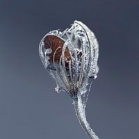 Dit is een uitgebloeide schermbloem. De gedroogde gekrulde steeltjes van de bloem sluiten een bruin blaadje in. Ze zijn bedekt met ijs omdat de mist die dag door de temperaturen onder nul opvroor. hierdoor lijkt de normaalonooglijke uitgebloeide bloemknop nu op een juweel met diamantjes. De foto is gemaakt met een macrolens met een…