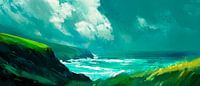 De zachte golven van de turquoise zee ontmoeten de groene kustlijn, terwijl dramatische wolken de lucht sieren. Dit levendige landschap straalt rust en vrijheid uit en is perfect voor de woonkamer om een gevoel van ruimte en harmonie te creëren. Een blikvanger die elke bezoeker betovert.