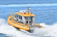 De K.R.V.E. 62 verlaat de haven op hoge snelheid, en creëert hierdoor hoge golven.