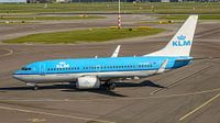 Deze Boeing 737-700 van de KLM is klaar om naar de startbaan te taxiën van luchthaven Schiphol.