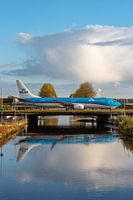 KLM Boeing 737-900 "Meerkoet", met registratie PH-BXP, taxiet over de brug die over de Hoofdvaart ligt naar de terminals van luchthaven Schiphol.