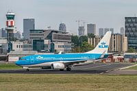 Een Boeing 737-700 van de KLM rijdt de startbaan op om te vertrekken van Rotterdam Den Haag Airport. Op de achtergrond is een gedeelte van de skyline van Rotterdam te zien.