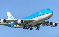 Een Boeing 747-400 van de KLM met de naam "City of Guayaquil" vlak voor de landing op Schiphol.