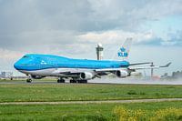 Een KLM Boeing 747-400 passagiersvliegtuig stijgt op vanaf een natte Polderbaan van luchthaven Schiphol.