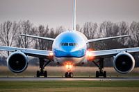 KLM Boeing 777-200ER lining-up voor take-off Polderbaan bij Schiphol een paar minuten na zonsondergang.