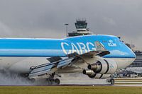 Deze KLM Cargo Boeing 747-400ERF is geland op een natte Buitenveldertbaan van luchthaven Schiphol.