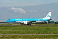 KLM Cityhopper Embraer ERJ-190 vertrekt vanaf de Polderbaan. Het vliegtuig is voorzien van een speciale sticker: Progress Pride.