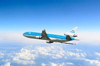 KLM (Koninklijke Luchtvaart Maatschappij) McDonnell Douglas MD-11 vliegtuig na de start van de luchthaven Schiphol boven de wolken in de blauwe lucht.