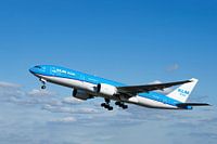 De KLM PH PQH Boeing 777-206ER, De Muur van Hadrianus, vertrekt vanaf Amsterdam International Airport Schiphol.