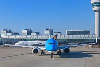 Vliegtuigen van KLM en Lufthansa op de luchthaven Amsterdam Schiphol in Nederland. De vliegtuigen staan geparkeerd aan de gates of taxiën naar de start- en landingsbanen rond het terminalgebouw.