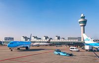 KLM vliegtuigen op de luchthaven Schiphol in Nederland. De vliegtuigen staan geparkeerd aan de gates of taxiën naar de start- en landingsbanen rond het terminalgebouw.