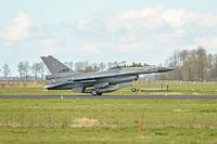 Deze General Dynamics F-16 Fighting Falcon tweezitter is net geland na afloop van een trainingsmissie.